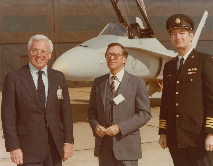 Gilles Lamontagne est le ministre de la Défense qui, en 1980, signe le contrat d’achat de 138 avions de chasse F-18A de McDonnell-Douglass. Sur cette photo, George S. Graff, président de cette compagnie, le ministre, et un haut-gradé.