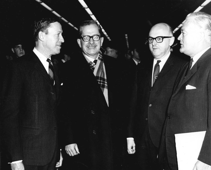 Quatre grands acteurs de la Révolution tranquille : le maire de Québec, le premier ministre Daniel Johnson, le maire Jean Drapeau et le chef de l’opposition Jean Lesage, réunis pour l’ouverture du tunnel Louis-Hyppolite-Lafontaine (janvier 1967).
