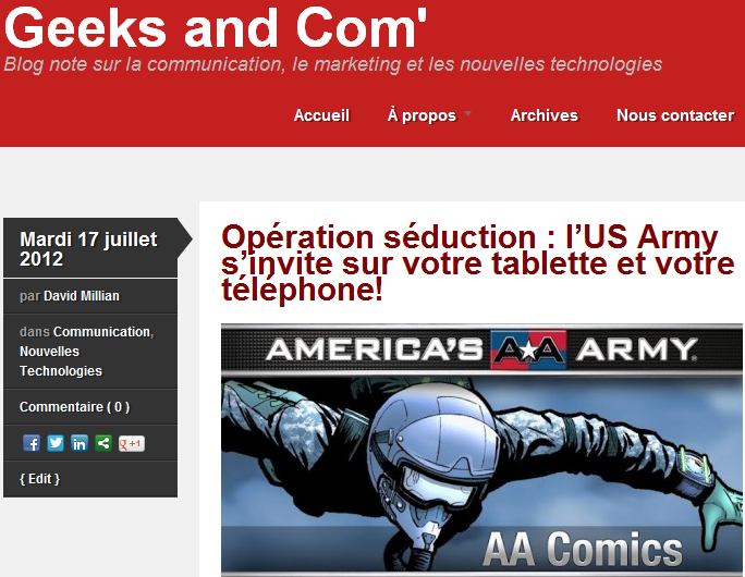 Mon premier post est très « geek & com » puisqu’il traite de la toute nouvelle application mobile de l’US Army – dévoilée ces derniers jours au Comic Con de San Francisco – à des fin de promotion et de recrutement. C’est par ici !